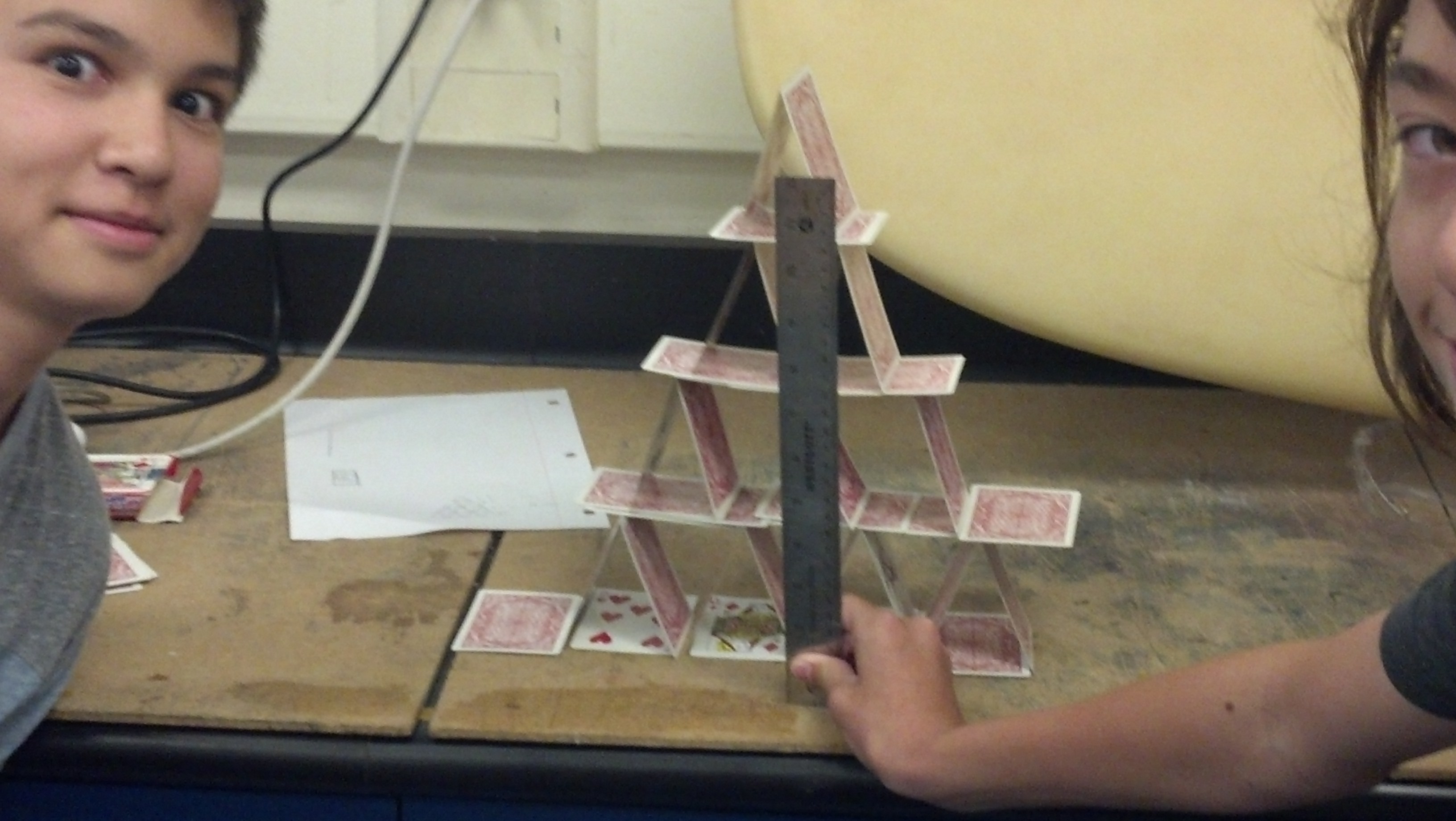 9/9/15 WednesdayWe did our wensday challenge of making a house of cards as tall as we can. We got second place, but because our bridge had the closest estimate we also technically also won the wensday challenge. Wensday Challenge: House of Cards